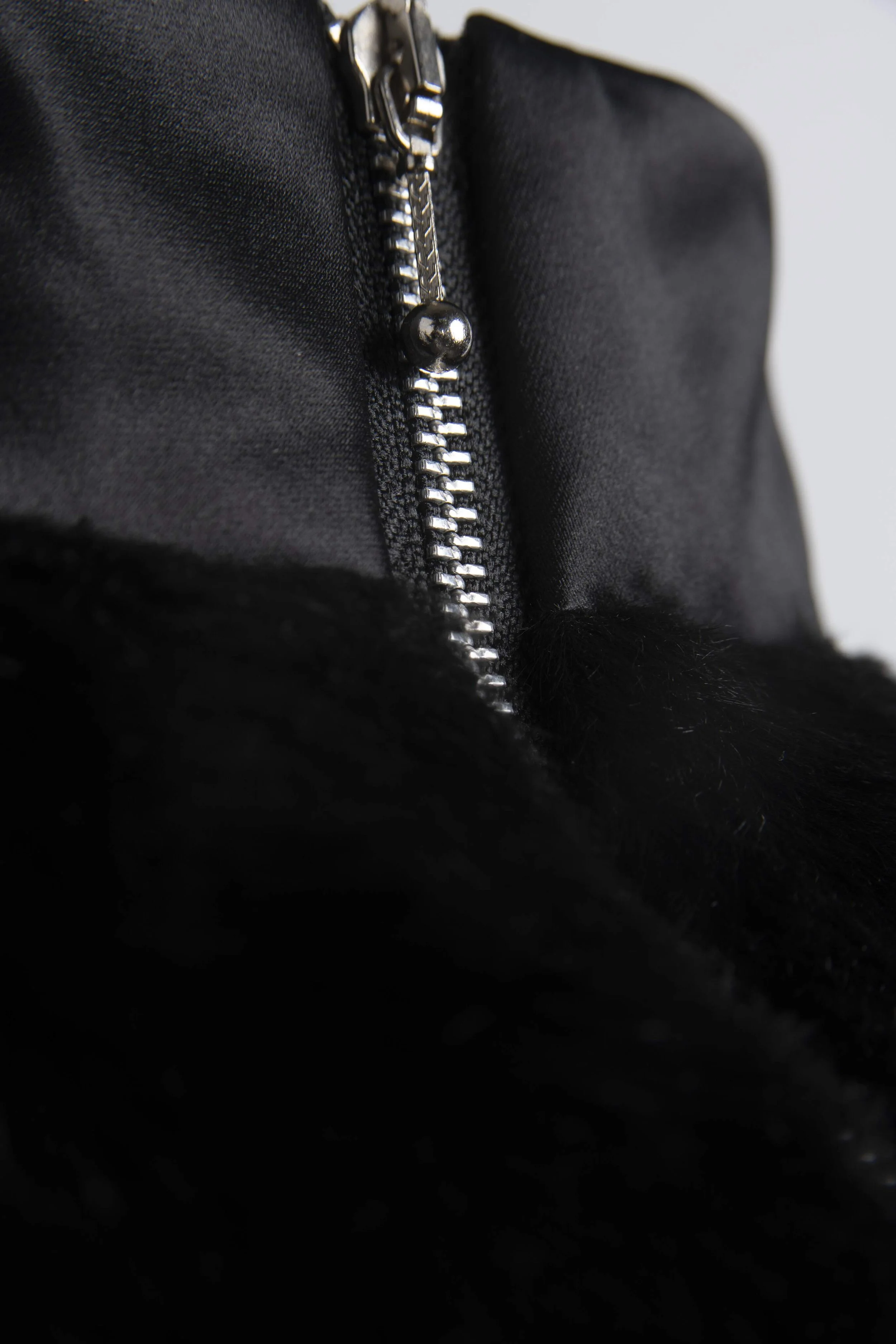 MATERIALS: FAUX FUR, SATIN SILK WITH BACK ZIPPER COLLAR. BUTTONED SLEEVE.